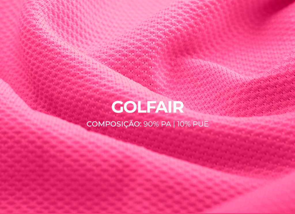 Desenvolvida com fios de poliamida, a Golfair une conforto, respirabilidade e toque delicado. Sua estrutura versátil permite aplicações que vão muito além do esporte, sendo ideal também para peças casuais e até alfaiataria esportiva. Leve, flexível e sofisticada, é a escolha perfeita para quem busca unir performance e elegância em um único tecido.