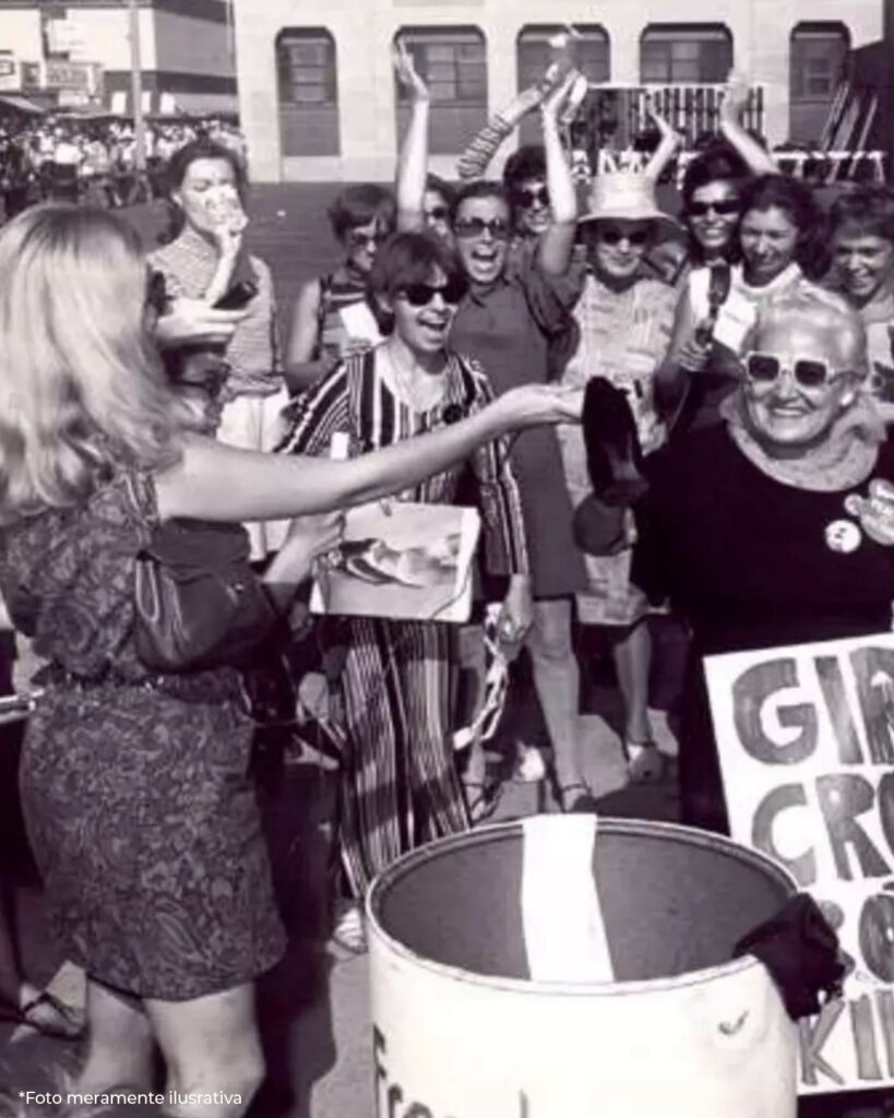 O protesto no Miss América de 1968 não passa de um mito, os sutiãs não foram queimados, mas sim descartados em uma ação simbólica junto com cintas, sapatos altos, cílios postiços, maquiagem, revistas masculinas como Playboy e Cosmopolitan, produtos de limpeza e até espanadores em uma lata batizada de “Lixo da liberdade”, acidentalmente um cigarro provocou o fogaréu e… Buuuum, a mídia da época transformou a “queima dos sutiãs” em uma lenda, e não sem motivo, articulado por um jornalismo sensacionalista que superficialmente falava do poder de escolha das mulheres contemporâneas daquele período, impulsionadas pelas ativistas do movimento feminista da segunda onda, (mesmo não tendo acontecido de fato) a matéria articulava muito mais sobre o perigo das incendiárias que o protesto de fato, o objetivo da matéria se cumpriu, o que capturou na imaginação do público e se tornou um símbolo duradouro (e pejorativo, na maiorias das vezes).